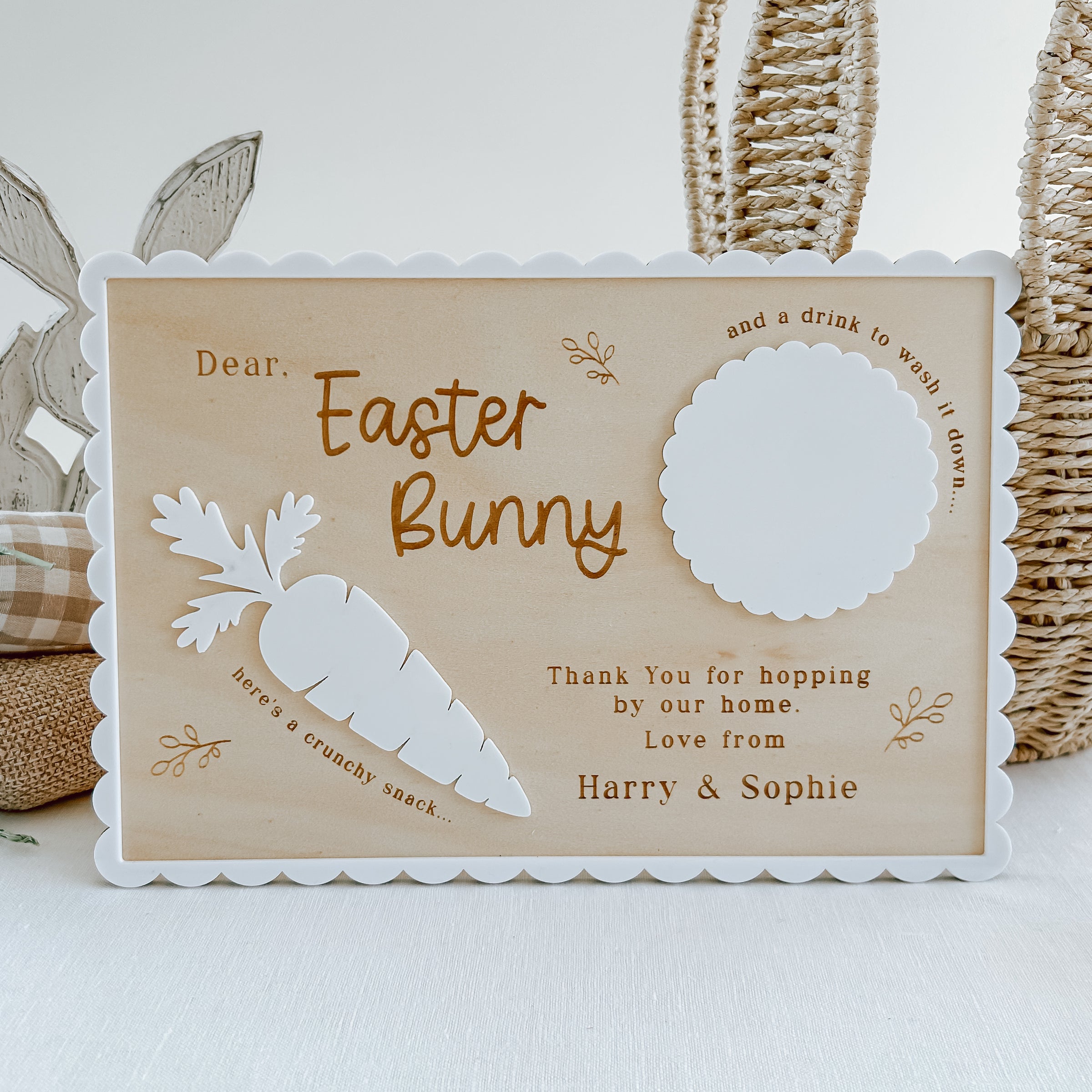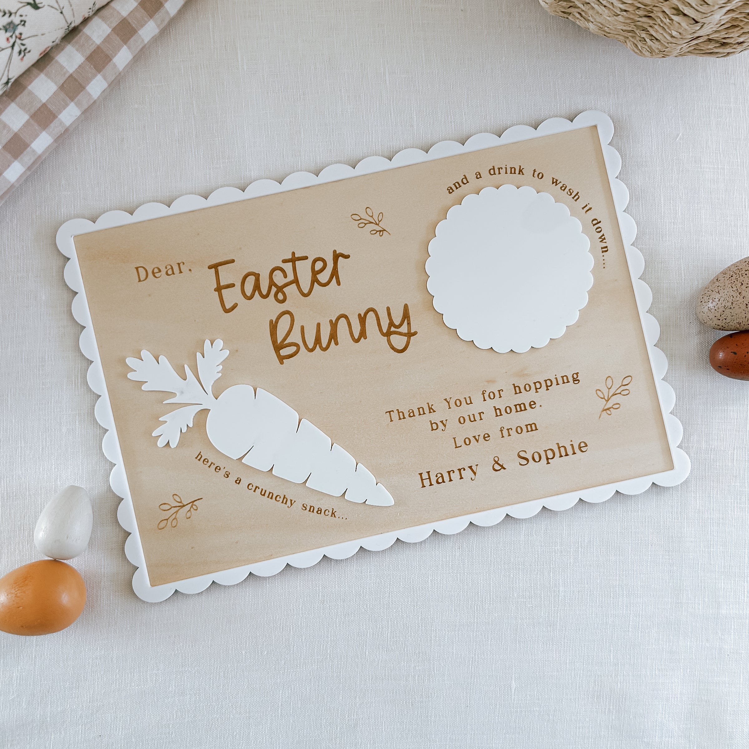 Make Easter extra special with our Engraved Easter Bunny Treat Tray! This beautiful Wooden tray features a delicate scalloped edge design and can be personalised with your family’s surname or your children’s names, creating a keepsake to enjoy year after year.